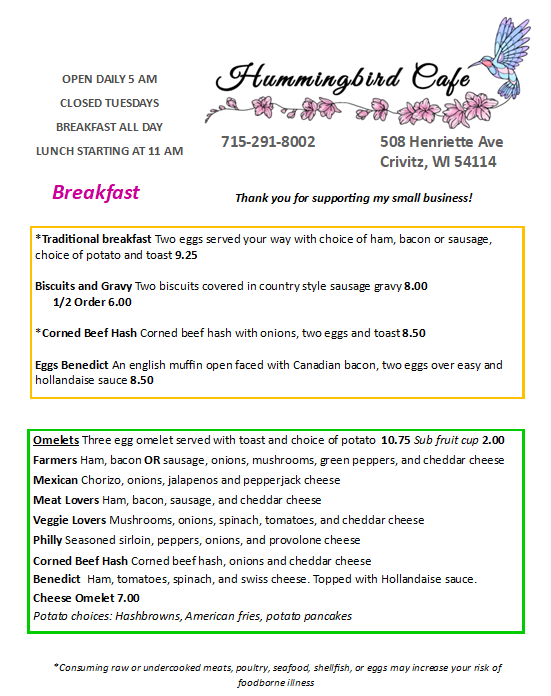 Welcome to Hummingbird Cafe, a culinary gem nestled at 508 Henriette Ave in Crivitz, WI. This charming cafe is renowned for its delightful menu, which beautifully merges comfort and creativity.